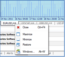 You can re-size and re-arrange all the open chart windows by clicking and dragging in the usual way. In addition, you can close, maximize, minimize or restore any chart by right-clicking on the tab at the bottom of the chart window – very helpful if your screen has ended up being a bit of a mess after a fair bit of re-sizing and re-arranging. If you want to take a closer look at a chart, simply press the ‘Zoom In’ icon in the top toolbar a few times until you get the view that you want. To restore it to the previous view, click the ‘Zoom Out’ icon, which is located right next to ‘Zoom In’.