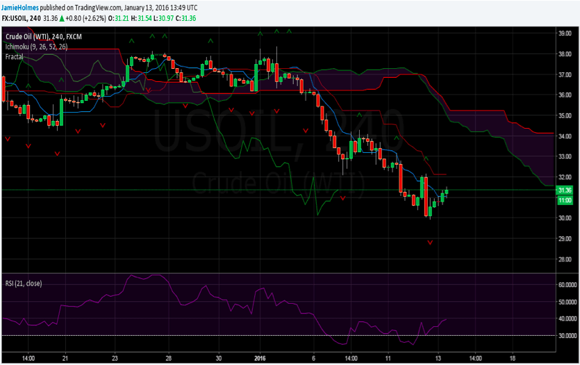 The next resistance after the base line will be provided by the Ichimoku cloud, or ‘Kumo’, currently around $34.20 to $35.20. The Ichimoku cloud has stopped trending downwards suggesting that the price of oil may range for a while before the market decides on the next direction. The relative strength index is trending upwards but still below 50, meaning bears have the upper hand. Seller should wait for a close back below the conversion line, currently providing minor support at $31.05. Furthermore, a push below the most recent buy fractal at $29.92 will see bearish momentum intensify and see sellers target $17.30.