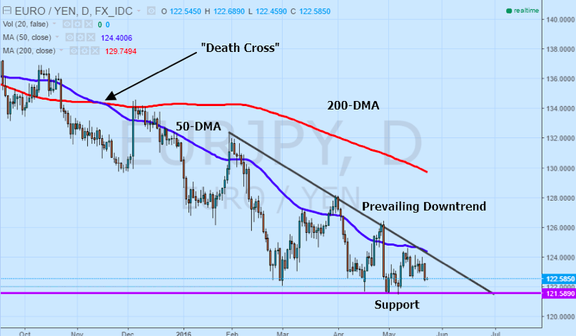 While recent data from France and Germany may suggest that European GDP is back on track, below trend growth continues to hobble the aggregate union, with most other members failing to capitalize on the benefits of record low interest rates and asset purchases designed to stoke economic activity. The most recent region-wide flash composite PMI underlines the uneven pace of recovery amongst regional economies, with the figure falling to the lowest level in 16-months, a sign that accommodation has fallen short. Additionally, recent consumer price index figures emphasize the worsening inflation outlook, with the headline CPI figure slipping back into deflationary territory during April to -0.20% on an annualized basis. With GDP growth forecast to slow during the second quarter, speculation is high that the European Central Bank will be forced to do more, further pressuring the Euro to the downside and adding to the ongoing weakness in the EURJPY pair which has fallen -8.51% over the last 52-weeks.