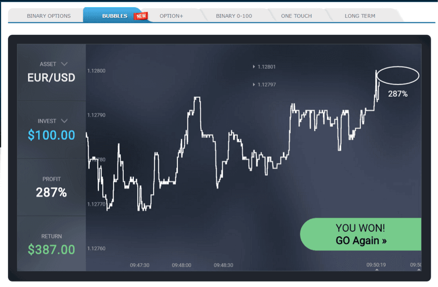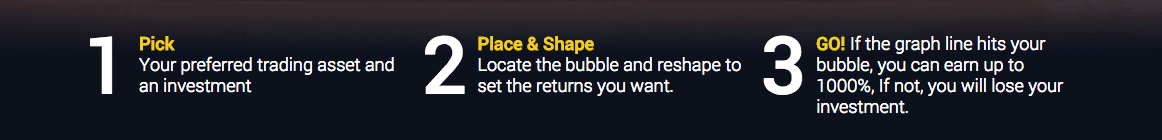 The bubble created by the Trader is then placed where it’s believed that the asset’s price will go. If the asset’s price intersects with the bubble at any time the trader wins.