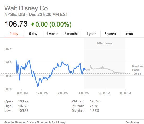 Disney Stock price 23d December 2015, Google Finance – Yahoo Finance – MSN Money