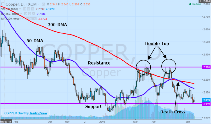Looking at the price action in copper over the last few weeks it is becoming considerably more evident that the bounce that began earlier in the year after the industrial metal touched multi-year lows has run out of steam. The double top that formed at $2.300, a resistance level reached but not crossed back in March, April, and May has been standing in the way of further gains for copper, suggesting that a renewed leg lower is gaining momentum. Support that remains in the way currently sits at $2.010, with any breach of this level paving the way for losses towards multi-year lows at $1.936. Adding to the ongoing bearish bias brought upon by the prevailing longer-term downtrend are the moving averages. With the 50-day moving average crossing the 200-day moving average to the downside, the emergence of the “death cross” in May is exceptionally bearish for the outlook.
