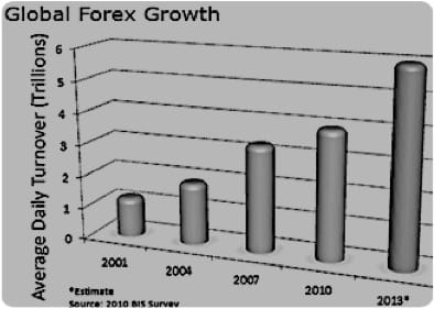 The size of the average daily forex turnover has been exploding. If in early 2005, CLS settled sides worth around $2 trillion Forex turnover on average per day, settlements averaged more than $4.5 trillion a day in 2011, according to the BIS Quarterly Review, March 2012. The trend will grow in the next years.