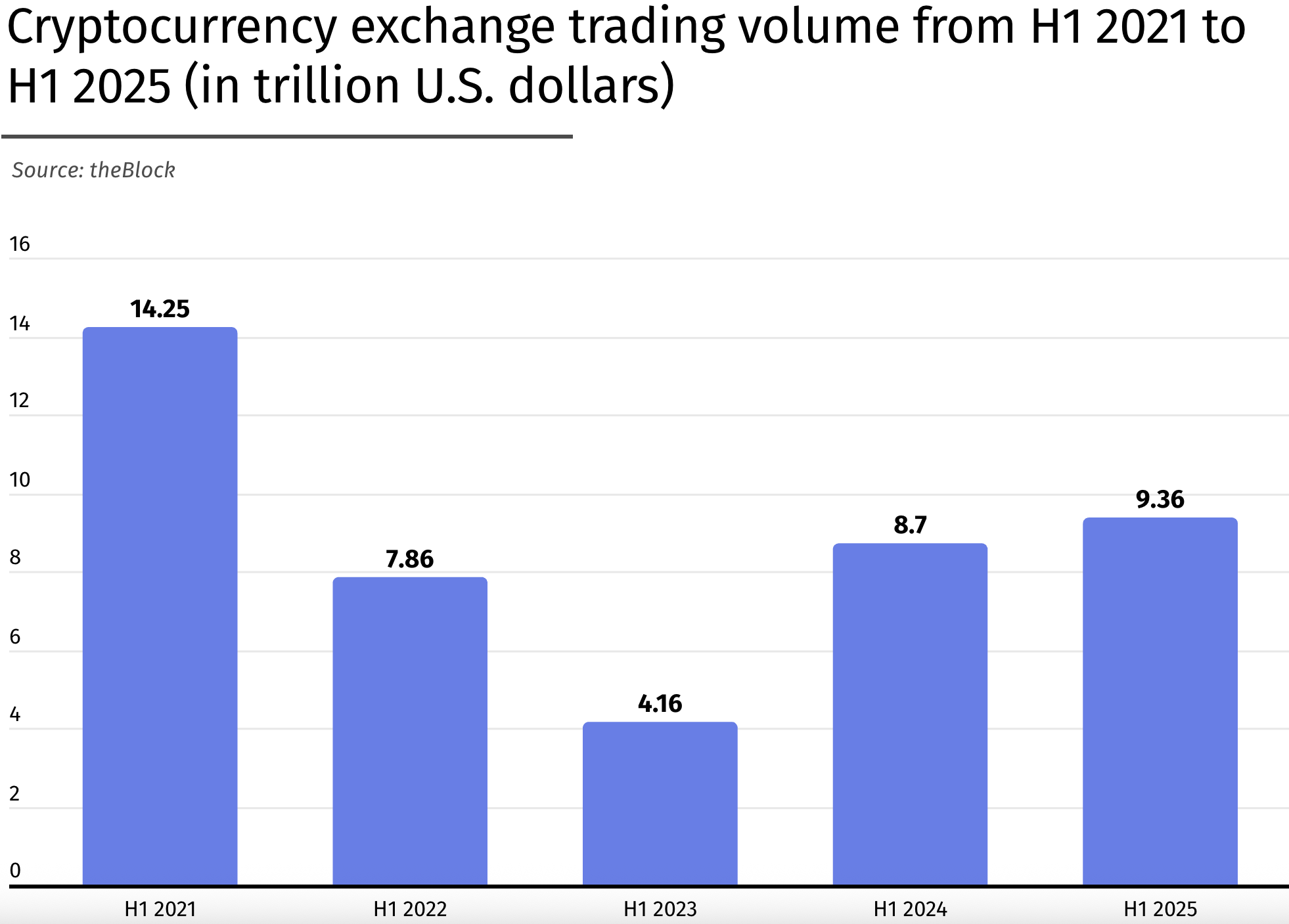 Cryptocurrency exchange trading volume from H1 2021 to H1 2025 (in trillion U.S. dollars) | Source: theBlock