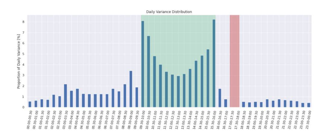 To further emphasize the point that relevant information might be missed when focusing solely on end-of-day data, we have broken down volatility at intraday intervals. The graph below displays the proportion of the realized variance of S&P 500 futures contracts over the previous 15 years attributable to each 30-minute interval during the day.