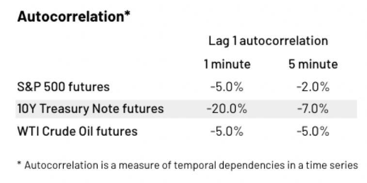 How do these two principles hold up in our example? The below chart shows the lag 1 autocorrelation for S&P 500, 10Y Treasury Note and WTI Crude Oil futures. In each case, the magnitude of the autocorrelation is higher at the 1-minute frequency than at the 5-minute frequency, and considerably so for the 10Y Treasury Note futures. Based on these observations, we define the volatility based on 5-minute intervals as the proxy for the true measure of volatility. Therefore we have chosen the 5-minute frequency as reference point to measure the accuracy of the various volatility estimates.