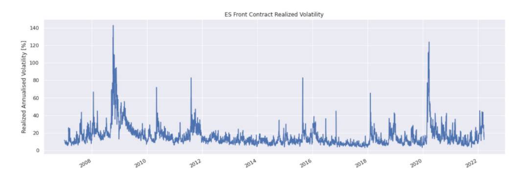 When evaluating the various estimates we use the realized volatility as proxied by the one based on 5-minute intervals. The below chart shows this realized volatility, annualized, over the full sample period. As expected, we see the largest spikes in volatility occurring during larger sell-offs, such as in March 2020 and during the Global Financial Crisis in 2008.
