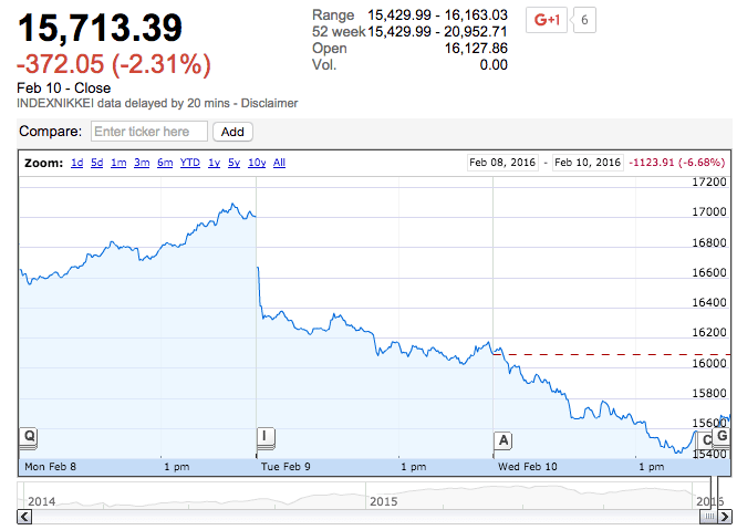 The benchmark Nikkei 225 dropped 372.05 points or 2.3% to 15,713.39, adding to Tuesday’s 5.4% decline. The Nikkei is down more than 20% since mid-2015, signaling that it had entered a bear market.