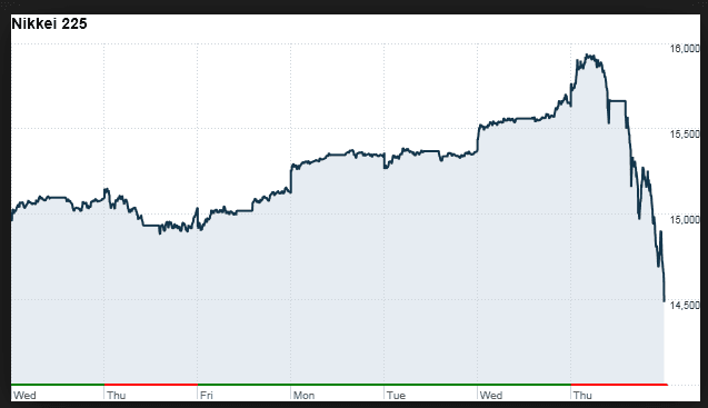 A litany of worries pushed Japanese stocks further into bear market territory on Friday. The Nikkei 225 plunged 760.78 points or 4.8% to 14,952.61, the lowest level since October 2014. With Friday’s drop the Nikkei is down more than 11% this week and 21% since the start of the year, putting it almost on par with China’s Shanghai Composite.