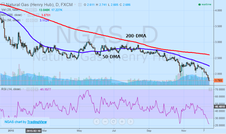 While currently in one of its worst losing streaks in over a year, after sinking 7 of the last 8 session, natural gas might have overshot to the downside from a technical perspective. A relative strength index not far from the 20 level indicates that gas prices are demonstrably oversold and a reversal might be just around the corner. Based on the lacking price momentum early in the session, the energy product might be vying for a rebound, mirroring the pullback in crude oil. Since 2014, the moving averages have largely acted as resistance after the 50-day moving average crossed the 200-day moving average to the downside, indicating a bearish pattern known as the “death cross”. Since then, prices of natural gas have been halved, and currently trades below both moving averages.