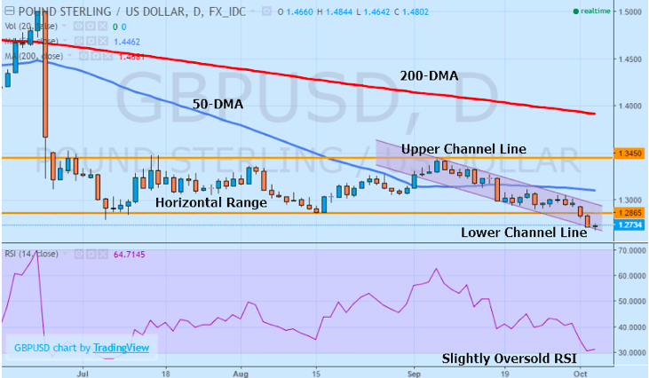 After trending relatively sideways for several straight months after the votes were tallied back in June, the GBPUSD has broken lower from its horizontal range as the momentum to the downside accelerates. Although the move that has transpired over the last few sessions might seem slightly oversold as evidenced by the relative strength index nearly falling to the 30.00 level, a rebound might not be imminent or prolonged. In the event of a technical correction, the main level to watch is the lower bound of the former range at 1.2865. However, with a candlestick close below this level, a move to the tune of 60.00-75.00% of the former range would be considered relatively normal for this type of breakout activity. Based on a range of 1.2865 to 1.3450, that implies a potential move lower of 350-440 pips lower.