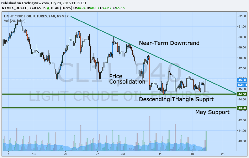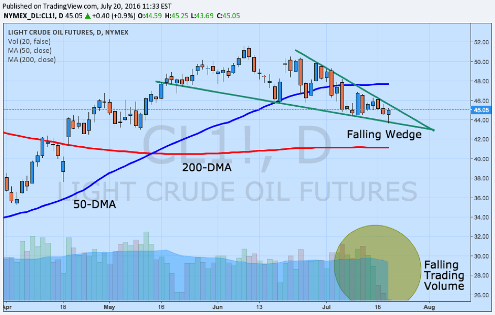 Crude oil prices have spent a considerable period of time consolidating over the last month and based on emerging trends looks to be on the approach of a directional breakout based on several key indicators. For one, even though intraday volatility remains significant in comparison to other asset classes, the narrowing price range combined with falling trading volumes suggests that prices could soon make a move. Although some technical traders would look at the price action within the context of a falling wedge, a traditional bullish continuation pattern in this particular setup, other indicators give a more mixed view of price action. The moving averages for instance are giving credence towards changing momentum as the 50-day moving average acts as resistance on the upside while the flattening 200-day moving average signals a potential oncoming shift while serving as support.