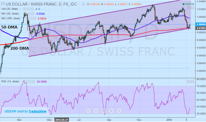 Meanwhile, despite the comments from policymakers, the Federal Reserve does not look to be examining more dovish and possibly negative rates quite yet. Although the timeline for the FOMC to raise rates additionally has been pushed back amidst the weak global backdrop, should US macroeconomic data manage to rebound over the coming weeks, it could see increased dollar momentum after profit-taking and reduced rate hike expectations sent the currency lower. However, the bounce in USDCHF could prove temporary, especially considering the rapidly unfolding weakness across Asia and accelerated demand for risk aversion. Although speculators have pushed the US dollar higher as risk sentiment shifts from yields to quality and safer assets, the US might not be the only beneficiary of this transition as evidenced by the swift uptick in in the Franc.