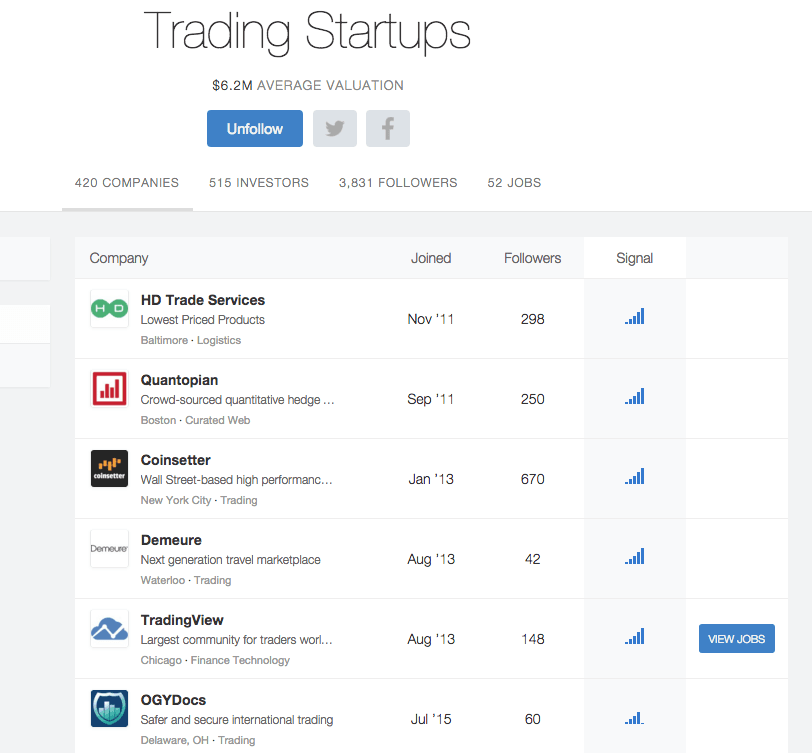 The investing platforms Angel.co highlights 420 trading startups / companies with 515 investors associated. Each of this startup has an average valuation of $6.2 M.