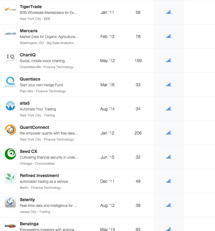 Some companies that we highlight are Quantopian, Coinsetter, TradingView, Quantics, Tradable, ChartIQ, Benzinga. Bellow some of the top companies highlighted by https://angel.co/trading