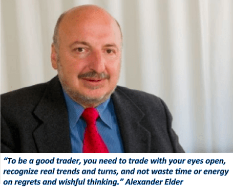 “To be a good trader, you need to trade with your eyes open, recognize real trends and turns, and not waste time or energy on regrets and wishful thinking.” Alexander Elder
