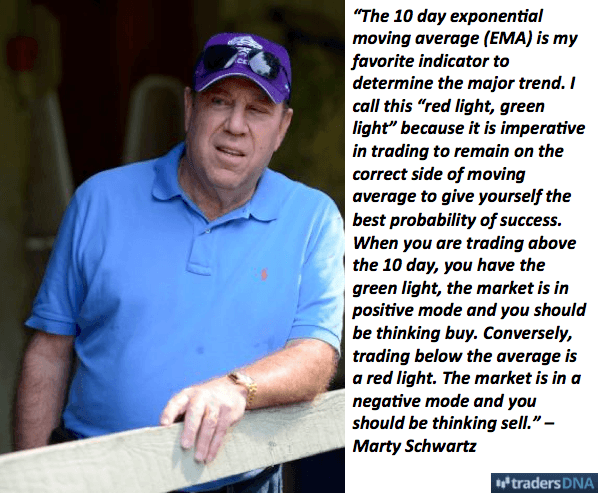 5.“The 10 day exponential moving average (EMA) is my favorite indicator to determine the major trend. I call this “red light, green light” because it is imperative in trading to remain on the correct side of moving average to give yourself the best probability of success. When you are trading above the 10 day, you have the green light, the market is in positive mode and you should be thinking buy. Conversely, trading below the average is a red light. The market is in a negative mode and you should be thinking sell.” – Marty Schwartz