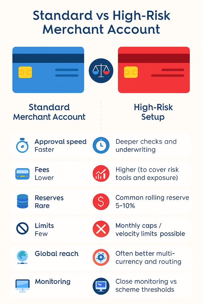 - Standard accounts can block international payments, while High Risk Merchant Accounts handle them seamlessly.